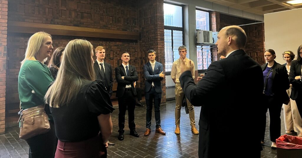 Akademia-regstudente kry ʼn voorsmakie van die hof tydens hoftoer saam met Solidariteit se Regsnetwerk