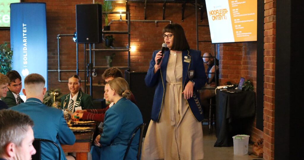 “Ons is vandag hier om saam te ontdek oor leierskap, maar die belangrikste is om te staan: Staan uit. Staan sterk. Staan saam.” Sy het afgesluit met ʼn herinnering aan die waarde van verbondenheid: “Verskillende skole sit vandag om een tafel. Julle gaan mekaar nog lank ken, en dalk in die toekoms weer raakloop, en dis ʼn voorreg!”