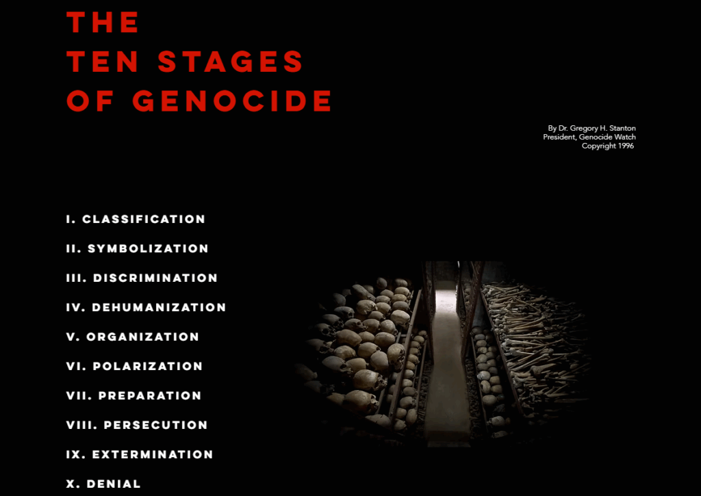 Ondanks die gevaar van die verkeerde etiket, is daar internasionale instrumente wat tog help om die erns van die situasie te meet – selfs al is dit nie amptelik “volksmoord” nie. Die organisasie Genocide Watch het die “tien stadia van volksmoord” as ʼn waarskuwingstelsel ontwikkel.