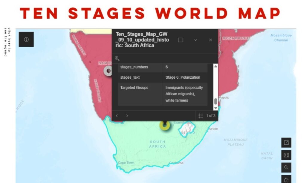 Verslae van hierdie organisasie dui daarop dat Suid-Afrika – met spesifieke verwysing na die gemeenskap van wit boere – reeds vir jare lank op ‘fase 6’ geplaas word. Die fase staan as “polarisasie” bekend en word gekenmerk deur verskerpte “ons teen hulle”-retoriek, haatspraak deur invloedryke politieke en sosiale figure, en propaganda wat groepe teen mekaar opstook.
